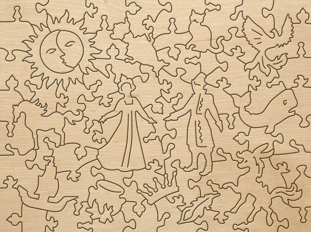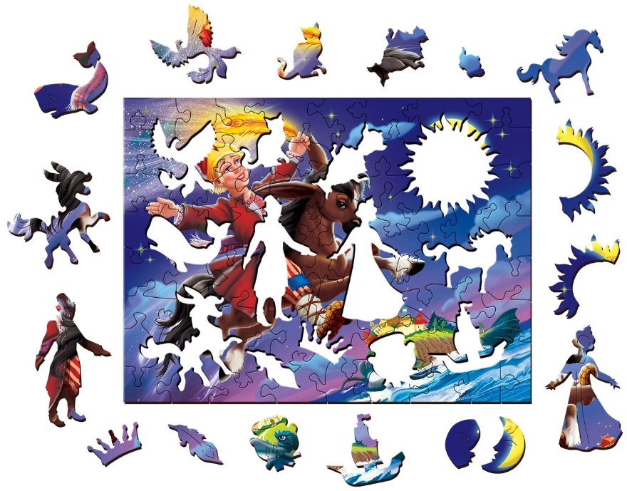 Пазл Страна сказок: Конёк-Горбунок состоит из деревянных фигурных элементов в количестве 77 деталей в виде персонажей из волшебной сказки «Конёк-Горбунок».