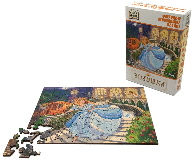 Пазл Страна сказок: Золушка состоит из деревянных фигурных элементов в количестве 76 деталей в виде персонажей из волшебной сказки «Золушка».