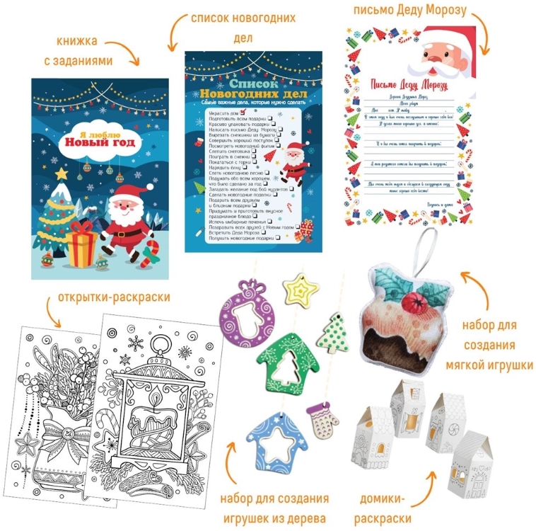 Для начала нужно не забыть выполнить все важные новогодние дела и обязательно написать письмо Деду Морозу – заготовки вы найдете в наборе. Также в чемоданчике спрятаны целых три набора для создания новогодних украшений: деревянные заготовки для елочных игрушек, выкройка на ткани и наполнитель для мягкой игрушки, а также бумажные заготовки для того, чтобы сделать волшебные домики. Перед тем как их склеивать, обязательно раскрасьте их крыши и стены в новогодние цвета! Это ещё не всё: очень важно испечь праздничное печенье и подготовить красивые открытки для друзей.