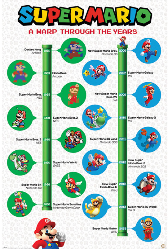 Постер Nintendo: Super Mario A Warp Through The Years создан по мотивам популярной игры о Марио. На постере изображены изменения игры с 1981 по 2015 год.