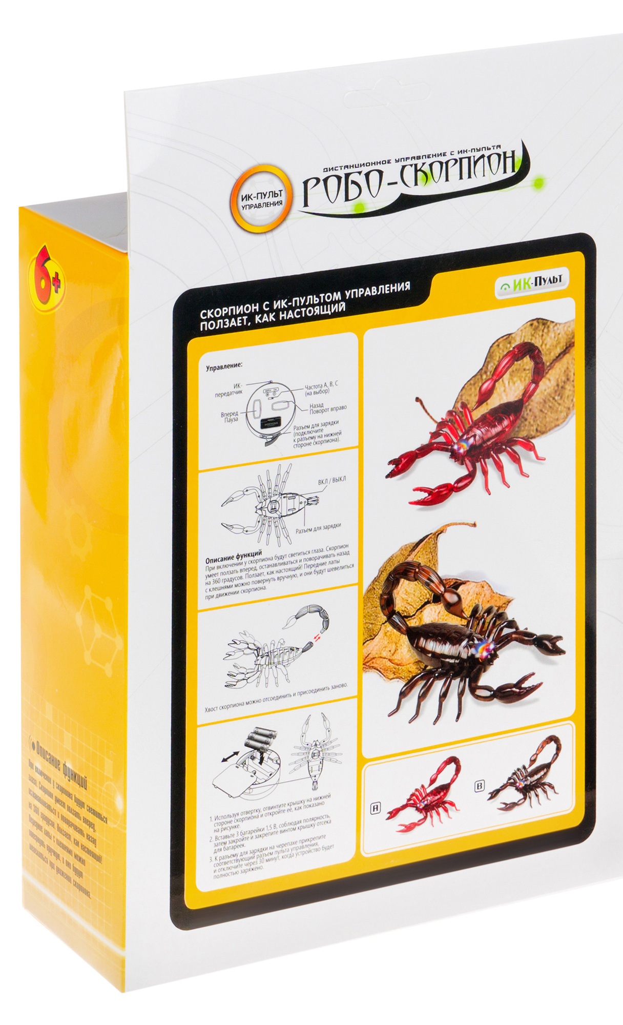 Оставить отзывРобот-скорпион с пультом ДУ по ИК каналу. Питание от батареек, в комплект не входят.