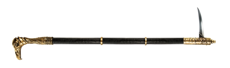 - Трость-клинок снабжена механизмом, позволяющим высвободить изогнутое лезвие или острие меча простым нажатием кнопки.