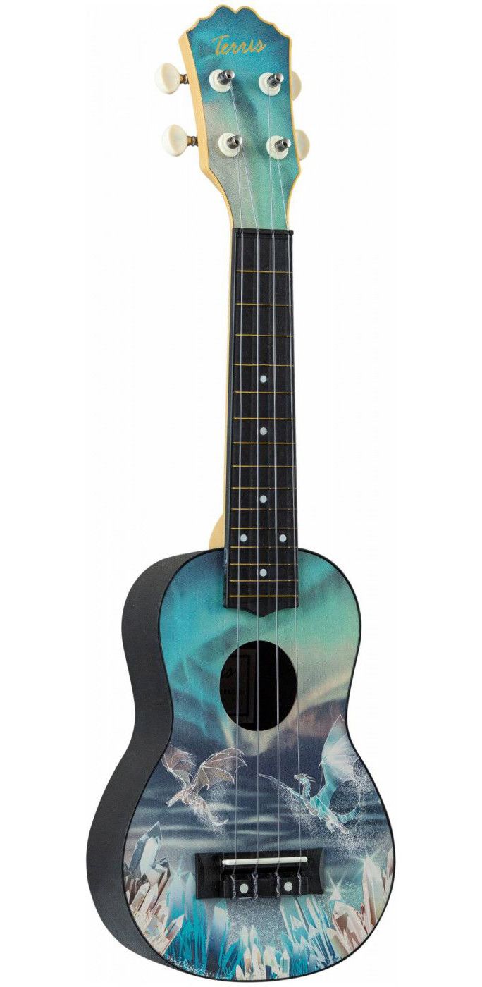Укулеле сопрано Terris PLUS-70 DRAGON – рисунок Дракон – завораживающая укулеле с парящими над кристаллами драконами на фоне северного сияния.