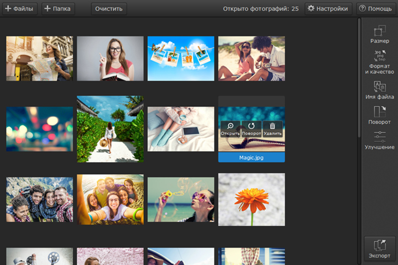 Movavi Пакетный Фоторедактор – это программа для уменьшения фото и их быстрой обработки, которая позволяет работать одновременно с большим количеством изображений. Вы сможете уменьшать картинки и улучшать качество, чтобы подготовить их к экспорту в интернет или сконвертировать в другой формат, чтобы очистить место на диске. Редактируйте папки с фотографиями за считанные минуты!