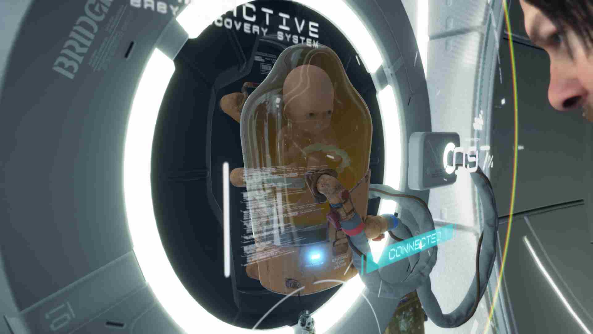 Кодзима приводит очень обширную экспозицию, поэтому большую часть первого часа игры мы будем смотреть срежиссированные ролики с минимальным геймплеем. Нам представят Тварей — мертвые души, попавшие в мир живых из загробного мира. Объяснят природу темпорального дождя — он вызывает моментальный процесс старения у любой живой органики. Расскажут, почему в обязательном порядке нужно незамедлительно кремировать погибших — в ином сценарии, некрозная ткань привлечет потусторонних существ, и произойдет взрыв. Такой же, которые прогремели по всей планете во время первого Выхода Смерти. Для чего нужны так называемые Бридж Бэйби/Би Би (Bridge Baby, BB), одного из которых мы носим у себя на груди.