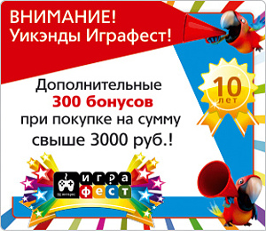 Только в выходные дни фестиваля Играфест, с 1 по 23 июня включительно, при покупке на сумму от 3000 руб, мы дарим вам дополнительные 300 бонусов в подарок !