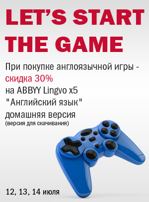 Только три дня с 12 по 14 июля включительно при покупке электронной версии англоязычной игры вы получите купон (промо-код) на 30%-ную скидку* на покупку домашней версии словаря ABBYY Lingvo x5 Английский язык на сайте 1С Онлайн. Данная версия включает 32 грамматических и общелексических словаря, содержащих более двух миллионов словарных статей.