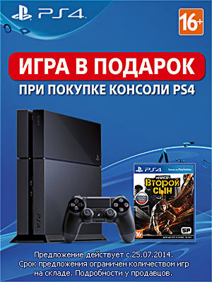 Акция завершенаС 25 июля до 14:00 часов 29 августа в мультимедийной сети «1С Интерес» все покупатели консоли PlayStation 4 получат в подарок игру InFamous. Второй сын для нее.