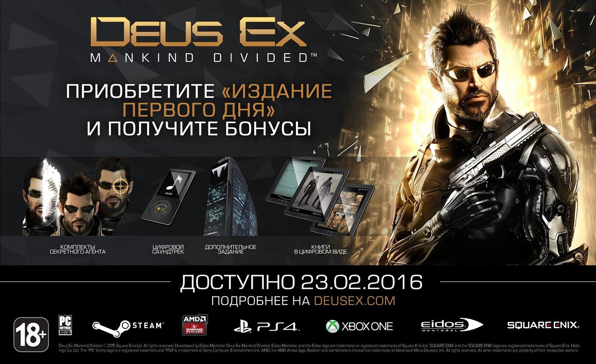 Акция завершенаСтартовал сбор предзаказов на игру Deus Ex: Mankind Divided в жанре Action / RPG с элементами шутера от первого лица, которая является логическим продолжением игры Deus Ex: Human Revolution 2011 года.