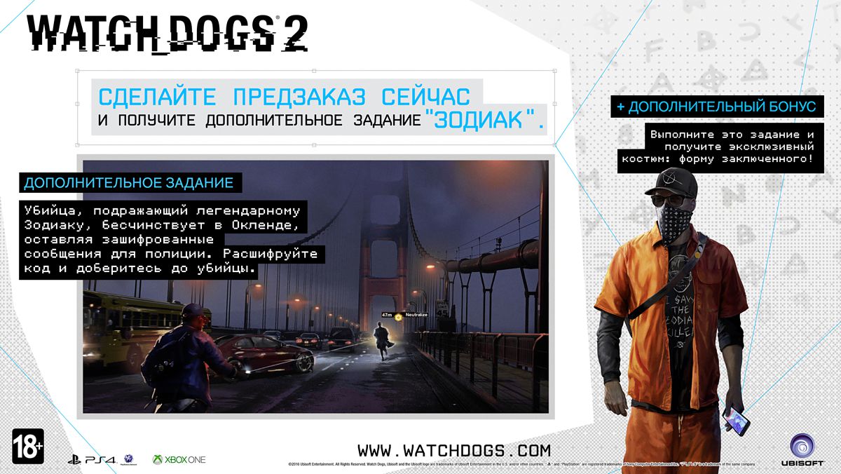 Дополнительное задание «Зодиак», новый костюм и скидка 500 рублей – в подарок за предзаказ игры Watch Dogs 2!