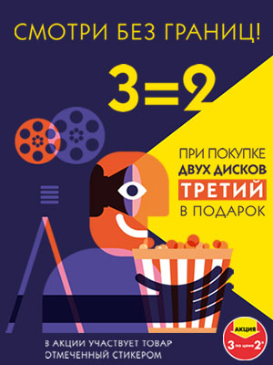 Акция завершенаФильм, фильм и еще фильм! Мультфильм, фильм и еще мультфильм! Мультфильм, мультфильм и еще мультфильм! Выбирайте любую комбинацию – для дружеских посиделок, для семейного просмотра, для долгого романтичного вечера, для детских праздников! С 28 января по 10 марта при покупке трех дисков DVD и Blu-ray из списка, вы оплачиваете только два, наиболее дорогих диска, а третий получаете в подарок!