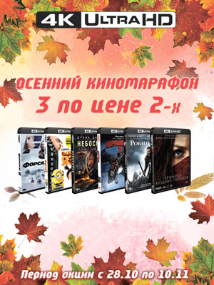 Акция завершенаОсень продолжает радовать теплыми днями, а мы – отличными предложениями! Покупайте больше ваших любимых фильмов в превосходном качестве! Ведь с 28 октября по 10 ноября при покупке трех дисков Blu-ray 4K Ultra HD, вы оплачиваете только два, а третий получаете в подарок!